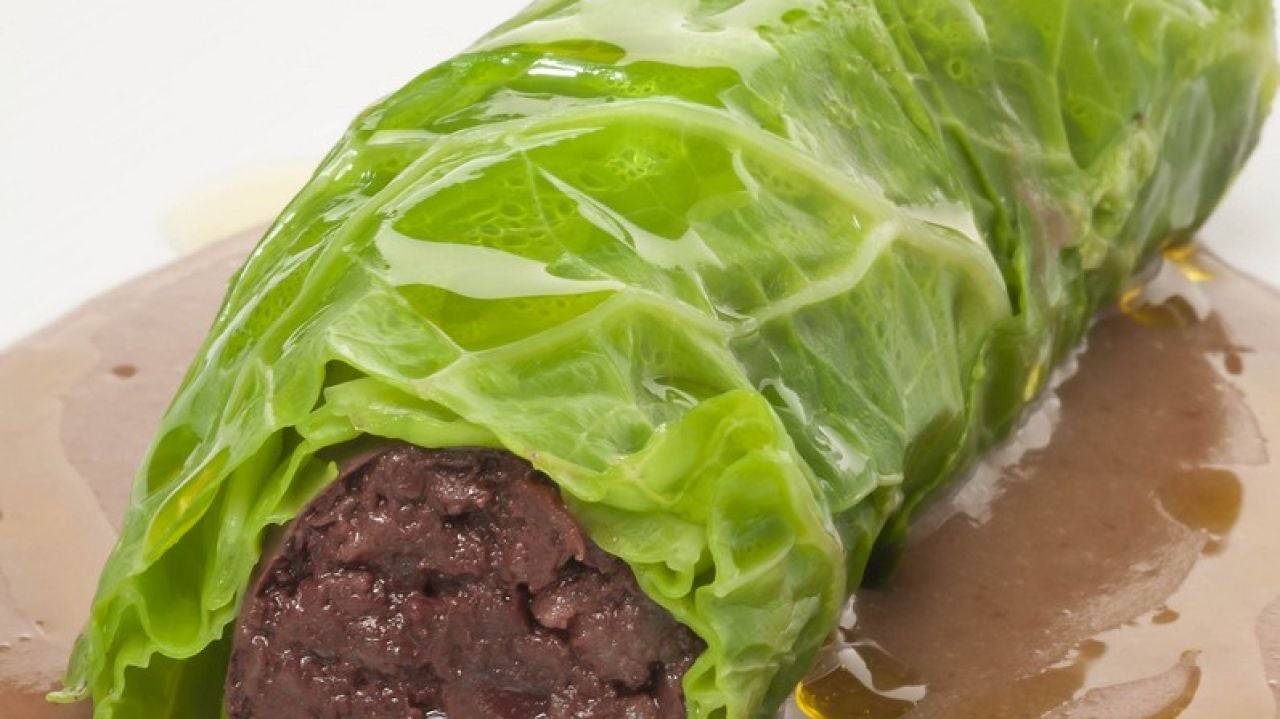 Ingredientes (4 p.): 200 g de alubias negras 1 morcilla de cebolla 4 hojas de berza 2 zanahorias 1 puerro 1 cebolleta 1 cabeza de ajos agua aceite de oliva virgen extra sal perejil picado vinagreta Pon las alubias a remojo de víspera. En el momento de cocinarlas pásalas a una cazuela con el agua del remojo. Riega con un chorrito de aceite, sazona y añade la cabeza de ajos, la cebolleta, las zanahorias y el puerro troceados. Cocina a fuego suave durante 1 hora y media. Pasa todo a una batidora de vaso y tritura. Cuela la salsa y mantenla caliente. Pincha la morcilla con un cuchillo (para que no reviente a la hora de cocer) y cocínala suavemente en una tartera baja y ancha con agua sin dejar que llegue a hervir; a una temperatura aproximadamente de 90ºC durante 1 hora. Pon a cocer las hojas de berza en una cazuela con agua y sal durante 10-15 minutos. Escurre. Estira las hojas de berza, pon encima de cada una un trozo de morcilla y envuelve. Sirve en el fondo del plato la salsa de alubias y coloca encima la morcilla envuelta en berza. Puedes acompañar con un poco más de salsa de alubias en un cuenco. Aderézala con vinagreta y un poco de perejil picado.