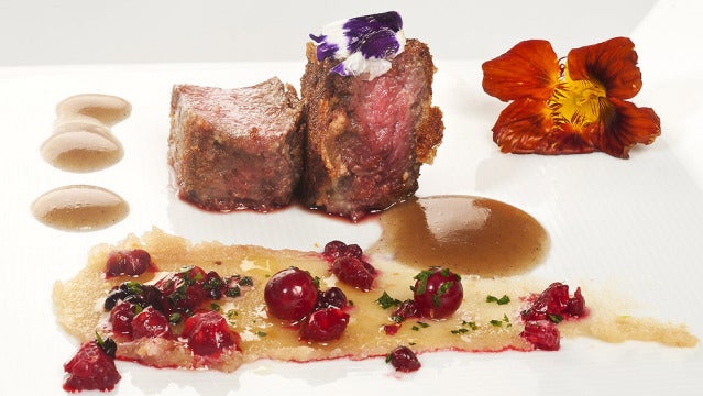 Ingredientes (2 p.): 200 g de lomo de venado 8 frambuesas 6 moras 1 rama de grosellas 100 g de almendra molida 1 rebanada de pan frito 1 diente de ajo 1 cucharada de azúcar 100 ml de salsa de carne 1 vaso de vino dulce pan rallado aceite de oliva sal perejil romero flores de pensamiento vinagreta Corte 1: -Freír la carne Elaboración: Forra un plato con plástico de cocina. Coloca encima las moras, las frambuesas y las grosellas. Envuélvelas con más plástico y congélalas. Para el mojo de mazapán, dora un ajo en una sartén con un chorro de aceite de oliva y ponlo en la picadora junto con el aceite. Agrega el vino, el azúcar, la almendra molida, el pan frito troceado y 2 frambuesas. Tritura. Corta el venado en tacos. Sazónalos y úntalos con el mojo por arriba y por abajo. Después, pásalos por el pan rallado y fríelos en una sartén con aceite de oliva y una ramita de romero. Mientras tanto, pon a calentar la salsa en un cazo y córtala con un chorro de aceite de oliva. Unta el plato con un poco de mojo de mazapán y pon encima los trozos de venado. Rompe un poco las frutas congeladas y espárcelas alrededor. Acompaña con la salsa bien caliente. Decora con una flor de pensamiento. Espolvorea por encima un poco de perejil picado y riega con una gotita de vinagreta.