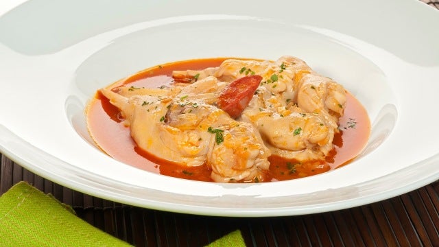 Ingredientes (4 p.): 12 manitas de cordero 4 zanahorias 2 cebolletas 1 puerro 1 cabeza de ajos 100 g de chorizo dulce 1-2 cucharadas de pimentón de la Vera 2 cucharadas de harina agua aceite de oliva sal perejil picado 1 hoja de laurel 1 guindilla 12-14 bolas de pimienta Olla rápida, 20 min Cocinar, 20 min Elaboración: Para el caldo, pon a cocer las manitas de cordero en una olla rápida con abundante agua y sal. Añade una cebolleta entera, la cabeza de ajos (reserva dos dientes de ajo), el puerro y las zanahorias troceadas y la hoja de laurel. Riega con un chorrito de aceite y agrega unas bolas de pimienta. Tapa y cocina el conjunto durante 20 minutos a partir de que empiece a salir el vapor. Retira la carne y deja enfriar. Reserva las verduras y el caldo. Pica la otra cebolleta y los dientes de ajo reservados y ponlos a dorar en una cazuela con un chorrito de aceite. Retira las pepitas a la guindilla, trocea y agrega. Añade el chorizo troceado y sofríe. Espolvorea con el pimentón, incorpora la harina y cubre con caldo. Introduce las manitas, prueba el punto de sal y añade las verduras cocidas (zanahoria, cebolleta y ajos). Menea la cazuela y cocina el conjunto durante 20 minutos. Espolvorea con perejil picado en el último momento y sirve.